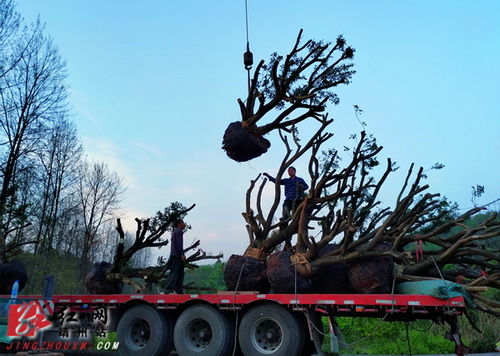 工人们正在起重机的帮助下,将杨梅大树苗装车发往外地用作园林绿化。