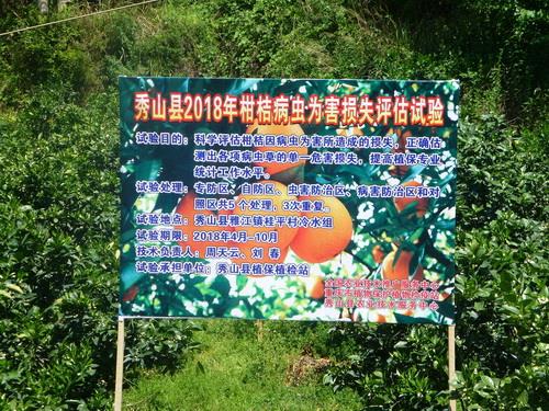 为提高植保专业统计工作水平,科学评估柑桔因病虫等生物灾害所造成的总损失,根据对单项病虫草危害损失的研究成果和病虫草的发生程度,结合当地面上的情况,正确估测出各项病虫草的单一危害损失,指导植保专业统计工作,按照全国农业技术推广服务中心、重庆市植保植检站统一安排,我县总结上年试验的经验,继续开展柑桔病虫危害损失评估试验。试验地点为雅江镇桂坪村冷水组盛果期成熟果园(秀山县金天地农业开发有限公司柑桔园)。柑桔品种为脐橙,试验共设5个处理:专防区、自防区、病害防治区、虫害防治区、对照区,3次重复。处理之间有土坎间隔,避免相互间产生影响。各处理按照当地关键防治时期和指标进行药剂防治。2018年4月18日,我站完成第1次施药。