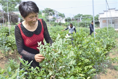 5月5日,宜都市枝城镇全心畈村蓝莓园里,工作人员正在观察蓝莓成熟情况。该园有蓝莓20多亩,目前即将上市,预计可创产值15万元。近几年来,该村探索走精品农业和观光旅游融合之路,相继流转土地2100多亩,并在流转的土地上建成了草莓、黄桃、蓝莓、葡萄等十多个采摘园,吸纳200多名村民就近入园务工,每年创劳务收入300多万元。不少农民还依托这些采摘园办起了农家乐,逐步走上了致富路。