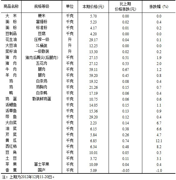 中国证券网讯(记者 郭晓萍)国家统计局4日公布50个城市主要食品平均价格变动情况(2012年12月21-30日),27个品种中仅香蕉的平均价格较上期下跌1%,其余全部上涨,涨幅最大的为黄瓜,较上期涨12.1%,其次为西红柿、大白菜。