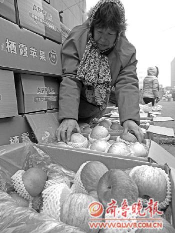 批发商刘建娥正在整理苹果。 记者 何泉峰 摄