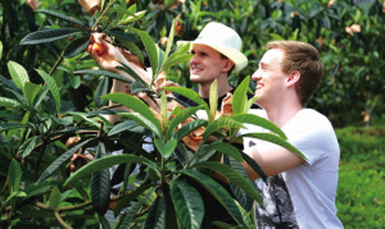 “看那个外国人,连枇杷米米都一起吃了!”海吃枇杷比赛活动现场热闹非凡,围观的游客、村民在台下笑做了一团。原来,今天的参赛选手是一群外国游客,第一次参加比赛有点紧张,情急之下,连皮带核地把枇杷扔进嘴里,惹得观众一阵大笑。丹麦王国驻重庆总领事馆商务参赞陈俊亦告诉笔者,台上的选手都是他来自丹麦的外籍同事,他们以前都不知道枇杷是什么,这次真可谓大饱口福!“他们都说枇杷真甜,要多买点回去,还要把广阳枇杷介绍给国外的亲戚、朋友。