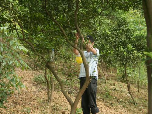 为了准确掌握柑橘大实蝇的生长发育特性,筛选诱杀柑桔大实蝇的有效诱饵,综合防治柑橘大实蝇的危害提供可靠技术保证,武隆县承担了西南地区柑橘大实蝇监测与防控技术研究与示范项目。该试验药剂包括:糖醋酒液(A)、水解蛋白(B)、化学诱剂(C)、正己烷(D)粗提物雌(E)、粗提物雄(F)。每种诱剂设三次重复,随机排列,共计18个处理。根据试验方案,2013年5月13日完成了全部处理的布设,正式开始了武隆县2013年柑橘大实蝇项目田间监测。