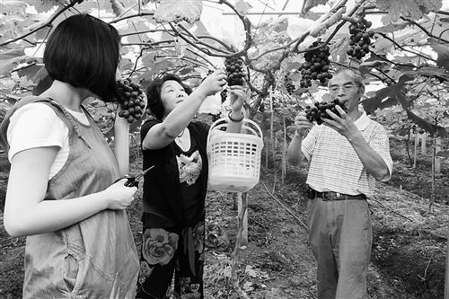 市民正在采摘大棚葡萄。记者 蔡杨 摄