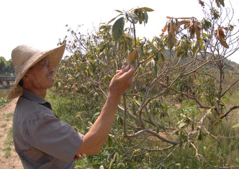 走到一片已经干枯的枇杷林前,马建良伸手摘下一片枯黄的树叶使劲一捏,“嚓嚓”声中变成了一撮粉末,“这些树都是散户的,因为没人浇水,都活不了。”