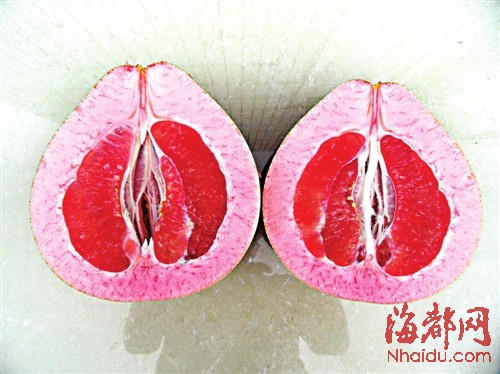“三红蜜柚”的选育带头人、福建农林大学园艺学院教授潘东明介绍说,“三红蜜柚”还有一个“表姐妹”——“红绵蜜柚”,果皮的海绵层和果肉白中透出淡淡的红色。