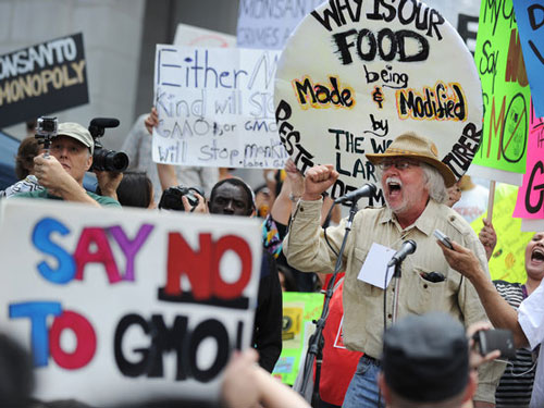 今年5月洛杉矶,一个抗议孟山都的团体。孟山都公司是农作物生物技术领域中的龙头老大。认为转基因作物有害的消费者在数百个城市开展了抗议活动。