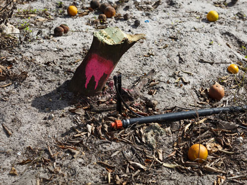 在南方花园柑橘公司的果园里,染上柑橘黄龙病的果树被打上标记、砍倒,然后焚烧。