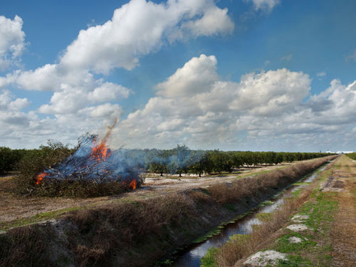 南方花园柑橘公司在佛罗里达州克莱维斯顿的果园,为了避免病害的进一步扩散,染病的橙树被焚毁。
