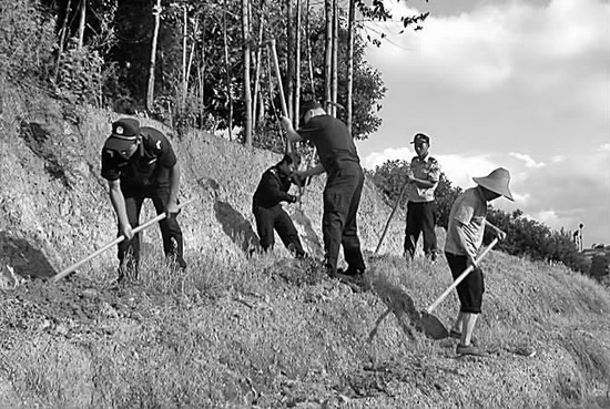 近日,华宁县公安局海镜派出所组织4名民警及3名协警员和农户一起种植枇杷树。青龙镇海镜社区和海关社区位于抚仙湖东岸,2014年年初由政府出资为农户引进枇杷树,栽种后由于连续干旱,树木成活率很低。7月初,政府补给农户一批枇杷树移栽苗,海镜派出所在开展党的群众路线教育实践活动中获悉该情况后,组织民警帮助农户栽植。 公孙红 摄