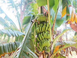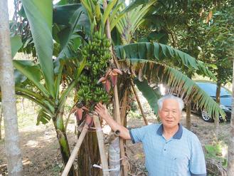 79岁农民庄陆种出一株4串的香蕉。 图:台湾《联合报》
