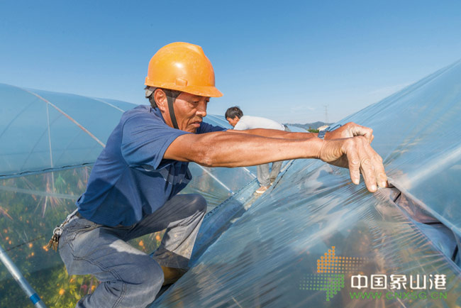近日,记者在定塘精创家庭农场看到,钢质连栋大棚里的“红美人”柑橘果实正逐渐转变为红橙色,沉甸甸地挂在枝头,只能靠绳子垂吊起来,工人们则忙着在大棚上铺设薄膜(如图)。