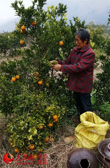 村民正在采摘被遗弃在地里的芦柑