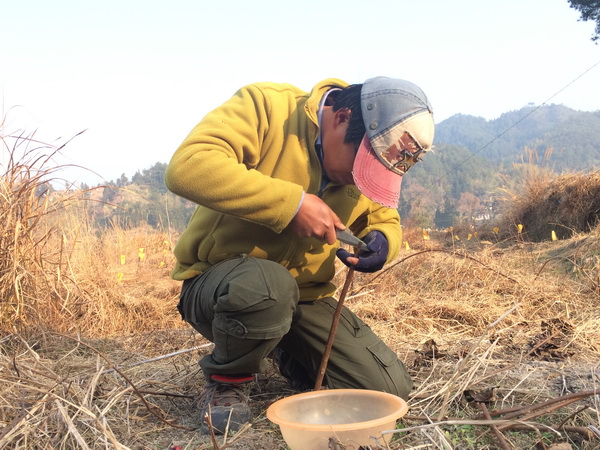 连日来,浙江省青田县阜山开维果业3号猕猴桃基地内一片繁忙的景象。在大学生创业业主唐海杰的组织下,来自四川的8位嫁接技术工正忙碌着给基地的实生苗实行嫁接,计划抢抓当前晴好天气,赶在雨天和伤流来临之前完成3号基地嫁接工程。为防止嫁接后遭低温冻害,他们还给每株嫁接苗戴上了“帽子”,起来保湿保温作用,提高嫁接成活率。
