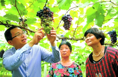 图为7月1日,“葡萄哥”韩甫在自己精心经营的葡萄园里,给前来取经的果农传授葡萄果实管理技术。邱海鹰 摄
