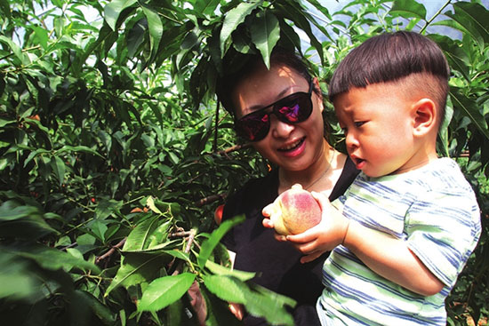 在脆桃种植园内,低、矮、密种植的桃树上挂满了桃子,不用使多大劲儿,小孩子都能摘下大而红的脆桃,这让采摘客们好不欢喜,他们一手拿着塑料袋,一手急急忙忙地采摘。“桃子好大哦!”来自重庆的徐女士告诉记者,去年已经来过了,家里人都说这里的脆桃清香甜脆,今年便把全家人都带来采摘。