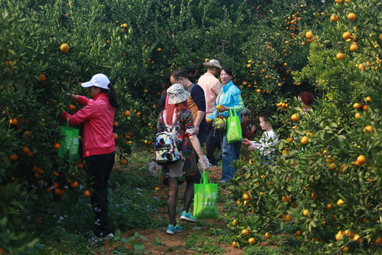 图为百名秦楚网友组团到丹江口橘园采摘柑橘。