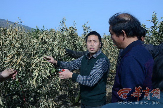 桔园镇刘家营村村支书张爱民介绍,刘家营村有橘树1400余亩,今年几乎都受到寒潮侵袭,无一幸免,现在正在邀请县果业局的专家进行现场指导,力争将损失降到最低。