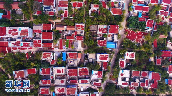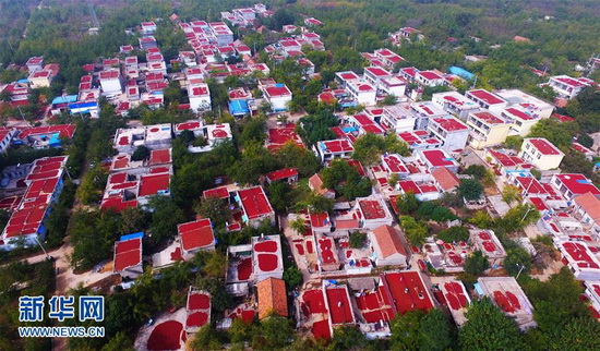金秋十月,山东枣庄峄城区阴平镇的枣树种植户迎来了丰收,纷纷将收获的红枣晾晒在房顶、门前。从空中俯瞰,村庄犹如披上了红色的锦缎,构成一幅美丽的农家“晒秋图”。 新华社发(高启民 摄)