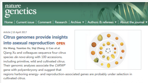 南湖网讯(通讯员 王霞 徐远涛)4月11日,《自然•遗传学》(Nature Genetics)刊物在线发表了华中农业大学邓秀新院士领衔的柑橘团队在无性生殖领域取得的研究进展(Genomic analyses of primitive, wild and cultivated citrus provide insights into asexual reproduction)。这项工作以柑橘原始种、野生种和栽培种的基因组为基础,采用比较基因组、遗传学和转录组等方法解析了柑橘“多胚”形成的分子基础,锁定了关键基因CitRWP。