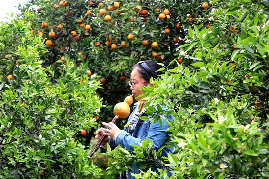 一名儿童在花果飘香的橘园里吹胡芦丝