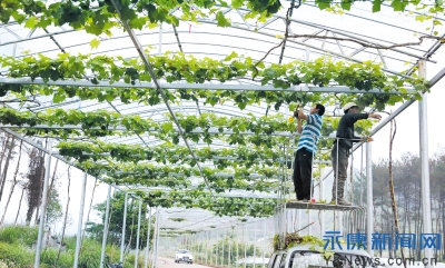 15日,在永康市唐先镇十里葡萄长廊下,几名管理人员对葡萄进行枝条修剪、扎条,既可提高产量,又能增添长廊美观。