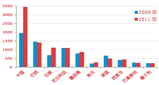 世界柑桔主产国柑桔栽培面积变化趋势(2000~2011)