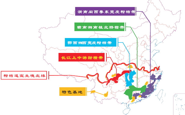 柑桔历来都是我国南方的重要果业,南起海南省北至陕、甘、豫、皖、苏等省的南部;东起台湾省西至西藏雅鲁藏布江下游,全国有20个省、市、自治区有柑桔栽培(不包括在露地条件下只能栽培枳的山东省),其中主产省、市、自治区有:浙江、福建、四川、湖南、广西、广东、湖北、重庆、江西、台湾等10个,云南、贵州还具很大发展潜力。柑桔分布地区辽阔、气候土壤复杂、品种资源丰富,各地创造出各自特色的栽培业。