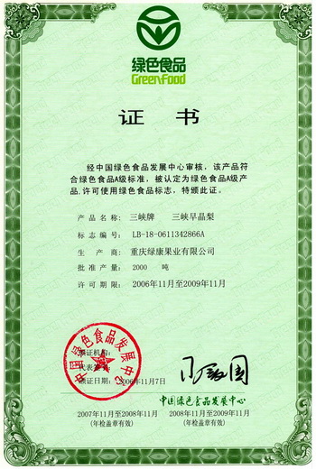 2006年底,中国绿色食品发展中心发布第58-67号公告,我公司的“三峡早晶梨”被正式列为“绿色食品”,农业部绿色食品认证编号为“LB-18-0611342866A”。“三峡”牌绿色食品的认证通过,标志着绿康基地生产的“三峡”牌早晶梨正式成为绿色食品。