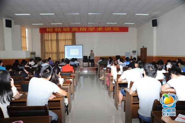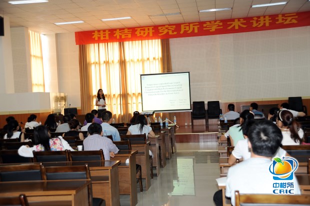 综防课题组胡军华副研究员的学术报告“Analysis of citrus against Alternaria alternata”拉开了整个活动的序幕,她深入浅出地分析了柑桔褐斑病的病原、发病特征以及防治方法,赢得了全场热烈掌声。随后,来自脱毒中心的王雪峰研究员就柑橘黄龙病病原微型转座子的研究进展向大家做了汇报,观众积极提问,对其研究表现出了高度的兴趣。高产课题组郑永强研究员讲述了自己在柑桔油胞病研究上的进展,让大家对他的研究有了系统的了解。来自改良中心的邹修平副研究员、脐橙课题的凌丽俐副研究员、资源课题的江东副研究员、质检中心的张耀海副研究员、加工课题的马亚琴副研究员、贮藏课题王日葵副研究员分别就自己的最新研究进展为大家做了精彩的学术演讲,观众踊跃提问,为大家创造了良好的学术交流气氛,既对研究生的实验有积极的启发意义,也为学科间、各课题间的科研合作创造了良好的条件。