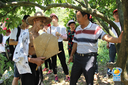 汽车缓慢行驶在蜿蜒曲折的盘山公路上,前方是一段坑坑洼洼的石子路,连续的高温少雨天气和来往的车辆,让路边的柚树蒙上了厚厚的灰尘,这是调研小组初到七星寨村的印象。队员们依次走访了三贫困户代表。据陶支书介绍,当地的主栽品种为红心蜜柚,通过芽变筛选到10多个品系,其中1号品系因其品质最佳而成为果农的首选。烈日当头,调研小组一行来到了一座瓦房后山坡上的果园。“我7点就在村口等着哩,你们可要救救我的这些树啊,你们看,那个虫子就一直吃我的树,我一颗树一棵树掏,一个洞一个洞灌药,可就是杀不完呐。”81岁高龄的陶大爷指着被天牛为害的树干痛心而无奈地说,看着天牛钻孔树干产生严重的流胶问题柑橘专家江才伦副研究员的指导下,同学们给出了防治办法,即每年5月到7月在天牛形成成虫前,在树干外围喷药的建议,这样既解决了成虫难以打药控制的难题,又减少了人工捕捉的辛苦。陶大爷激动地说:“你们要是早点来就好了!”