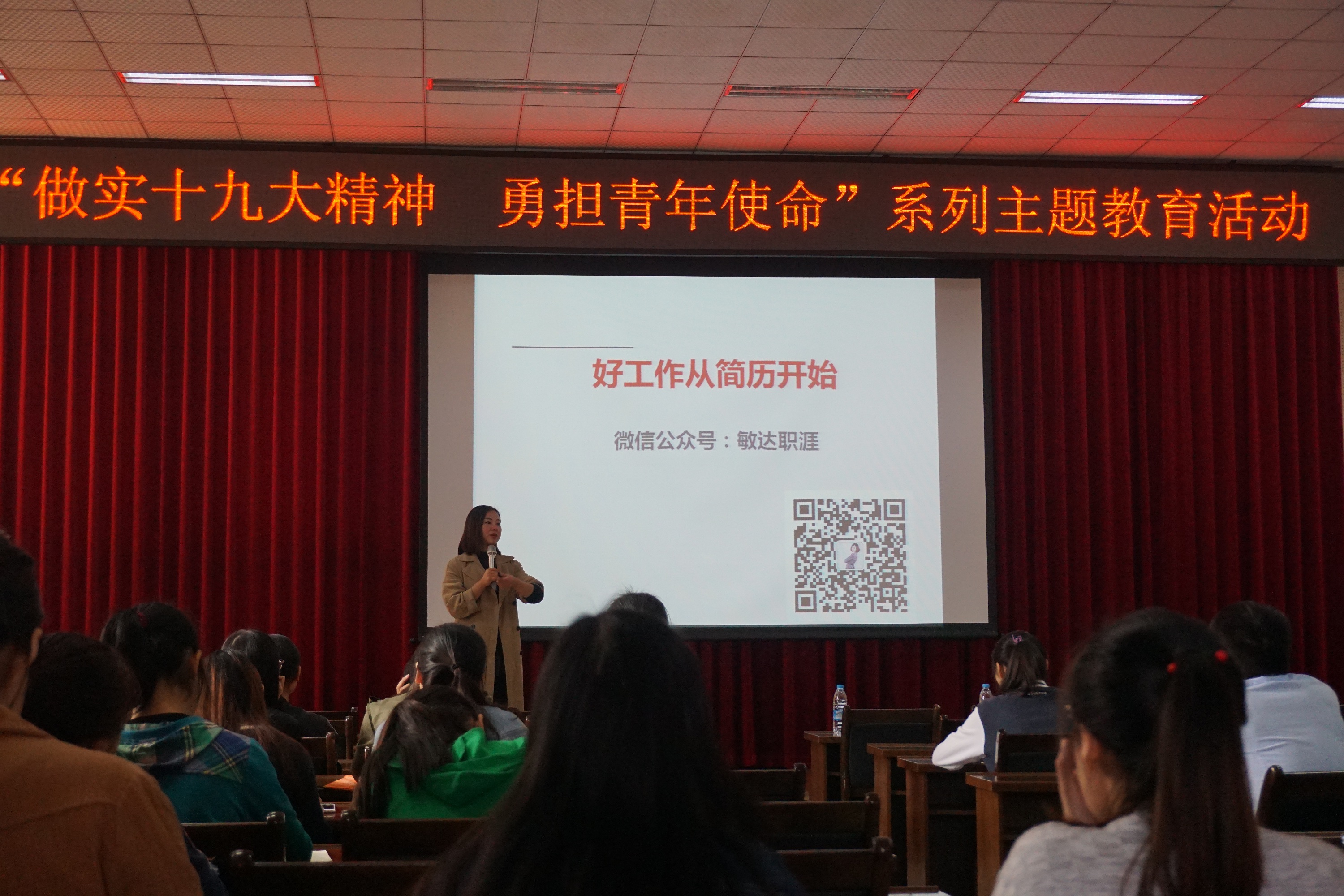 为推动我所研究生实现更高质量和更充分就业,11月3日下午,“做实十九大精神 勇担青年使命”系列主题教育活动在研究生公寓多功能厅举行。学校招生就业处就业科科长田振敏老师应邀担任首期主讲嘉宾,为同学们带来题为“好工作从简历开始”的求职培训。全体在所研究生参加本次培训会。