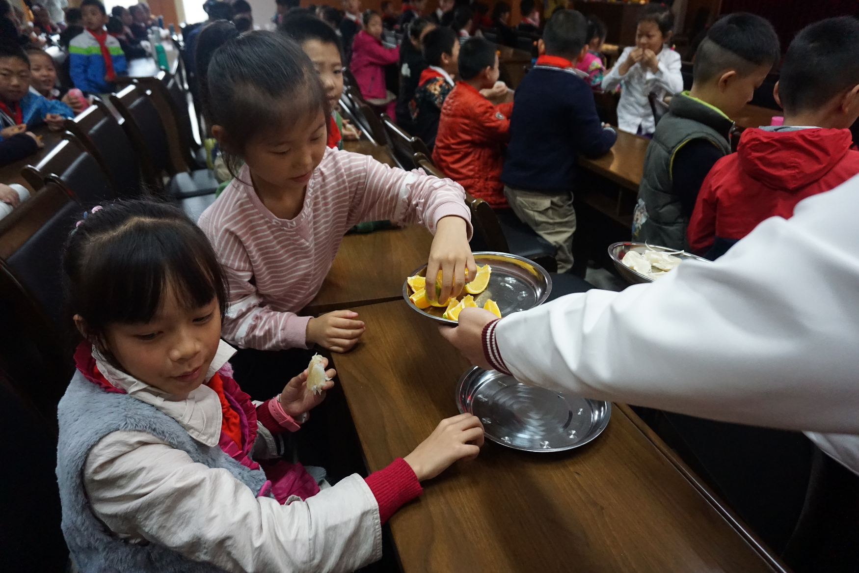 随后进入第二部分柑桔果品品尝。研究生将东风早柚子、温州蜜柑、贡桔和奉节脐橙分发给同学、老师及家长们。聆听讲座和亲自品尝相结合的方式使大家对柑桔各种品种有了更具体的认识。新鲜甜美的柑桔果实让大家啧啧称赞。