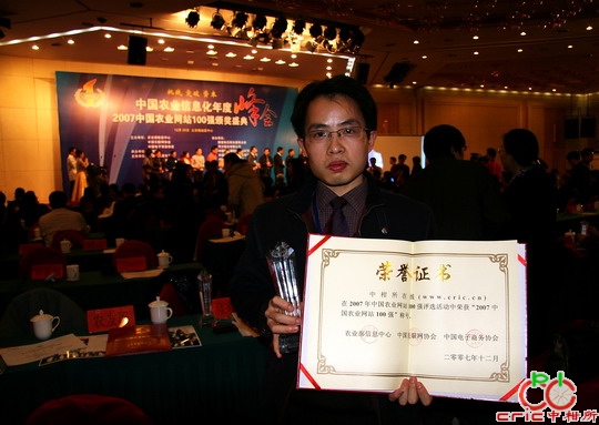 "中柑所在线"北京报道 由农业部信息中心、中国互联网协会、中国电子商务协会共同主办,农博网承办的中国农业信息化年度峰会暨2007中国农业网站100强颁奖盛典12月20日在北京梅地亚中心隆重举行。