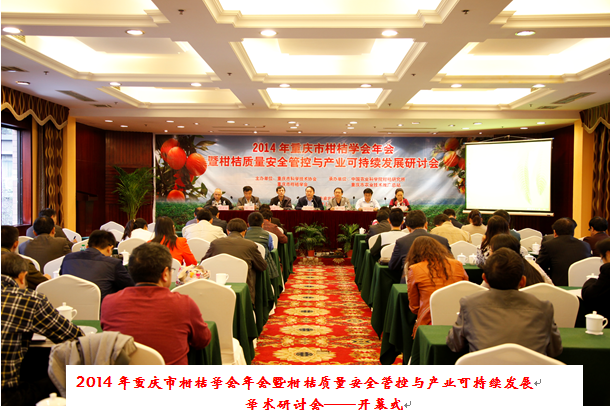 2014年10月31日,按重庆市科学技术协会学术活动月安排,重庆市科学技术协会和重庆市柑桔学会主办、中国农业科学院柑桔研究所(以下简称“中柑所”)和重庆市农业技术推广总站承办在渝北区犀牛宾馆召开了2014年重庆市柑桔学会年会暨柑桔质量安全管控与产业可持续发展学术研讨会,主题是柑桔质量安全管控技术支撑产业可持续发展。中柑所副所长、重庆市柑桔学会理事长焦必宁研究员主持了开幕式。中柑所、重庆市农业科学院果树研究所、重庆市农业技术推广总站、四川省农业科学院园艺研究所、西南大学科协、西南大学园艺园林学院、奉节县脐橙研究所、以及安岳县、邻水县、巴南、渝北、万州、梁平、垫江、云阳、奉节、开县、巫溪等18个科研院所和市区县技术主管部门以及重庆晚脐“红翠2号”选育企业―重庆市夔门红翠脐橙合作社有限公司、重庆锦程实业公司等派人参加了本次会议,与会代表共计65名。
