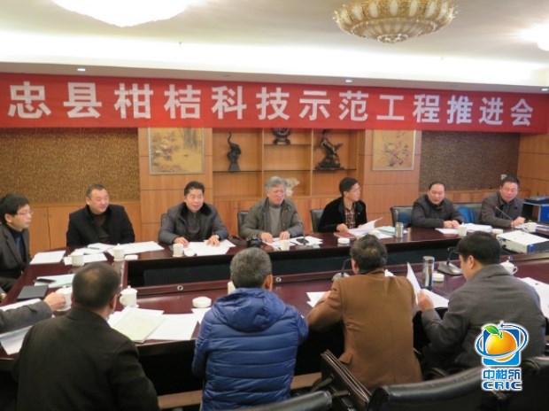 2014年12月18-20日,重庆121科技示范工程“重庆忠县国家农业(柑桔)科技示范园区科技支撑示范工程”项目推进会在忠县海新酒店召开,本示范工程项目组织方、技术综合方、集成实施方和集成示范课题负责人及代表等共计二十余人参加会议,忠县分管柑橘产业的县领导忠县政协副主席杨胜明出席会议并讲话。与会代表对本示范工程涉及的重庆忠县柑桔国家科技农业园区核心区、核心示范果园、品种区试园、信息化远程管理系统、皮渣高值化利用工厂和皮渣肥料厂等项目进展和基础设施建设情况进行了实地调研和进度检查,并对于项目进展、问题和对策进行了深入讨论。