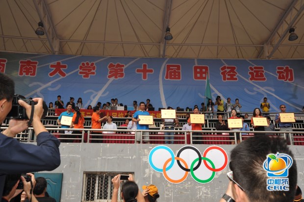 4月24日上午8:30,西南大学第十届田径运动会拉开帷幕,在以 “足球歌舞剧”、“春夏秋冬”为主题的开幕式上,对2014年度体育工作进行了总结表彰,我所获得2014年度体育工作先进单位,所工会饶述军主席代表我所上台领奖。开幕式后,教职工组比赛在第一运动场正式开始。我所教职工共52人参加比赛,保持往年的优势,在两天半的比赛中,拼搏进取,与30多个教工单位展开了速度与激情的较量,夺得教工组团体第三名。