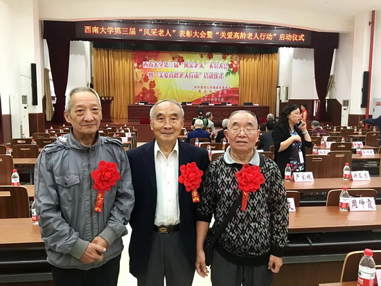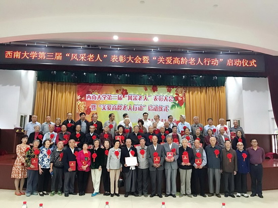 岁岁重阳,今又重阳,在尊老、敬老、爱老、助老的重阳老人节到来之际,10月9日上午,学校召开西南大学第三届“风采老人”表彰大会暨“关爱高龄老人行动”启动仪式,学校党委副书记徐晓黎、安春元,校长助理刘光远,校工会主席刘文政,离退休党委书记何晓阳、离退休工作处处长李素伟出席会议,向西南大学第三届65位“风采老人”颁发荣誉证书,柑桔所路有涛、陈全友、易雄、余志怀、邓功秀5位同志获西南大学第三届“风采老人”受到表彰。