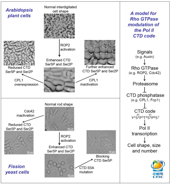 Rho GTPase是细胞生长和形态发生中及其重要的信号调节分子,尽管已有20余年的研究,关于Rho如何在转录水平上调节细胞形态一直未有报道。该研究组首先通过遗传学手段发现,拟南芥中的Rho家族成员ROP2激活后能够降解一个作用于Pol II C端结构域(CTD)的磷酸酶CPL1,进而提高Pol II CTD的Ser2和Ser5磷酸化水平,最终改变子叶表皮细胞的形状。而且,这个从Rho到Pol II的信号传导捷径也在控制酵母细胞形状上起关键作用。因此,该项研究不仅首次发现在单细胞和多细胞真核生物体中细胞形态发生的全新转录调节机制,更重要的是,提供证据证明了信号传导分子能通过这一捷径直接调节Pol II CTD磷酸化水平,比经典的间接调节模式(即信号分子首先激活特异性的转录因子,进而影响通用型的转录因子或者Mediator的组分,最终影响Pol II磷酸化从而启动基因转录)更快调控大规模的基因表达。