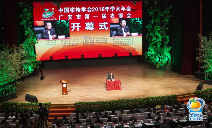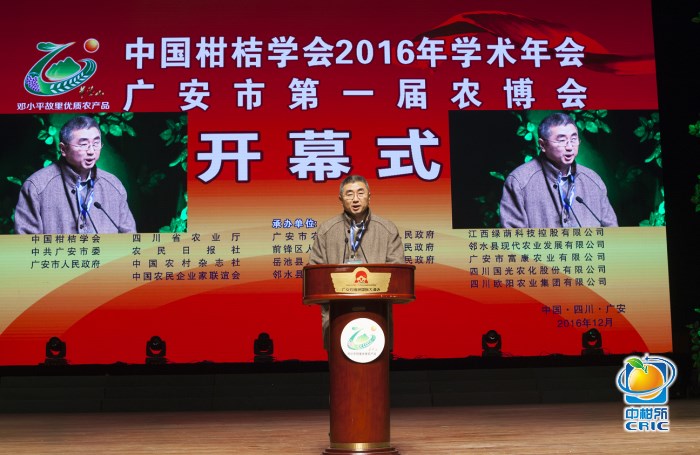 在橙黄桔绿的美好季节,12月3日至4日,中国柑桔学会2016年学术年会暨广安市第一届农博会在广安市民广场召开。中央农村工作领导小组原办公室主任、中国扶贫基金会会长段应碧,全国政协常委、中央农村工作领导小组原副主任、办公室主任陈锡文,全国人大常委会委员、华中农业大学校长、中国工程院院士邓秀新,农业部种植业管理司副巡视员杨礼胜,中国柑桔学会理事长、副校长周常勇以及广安市委书记侯晓春、市长罗增斌等出席开幕式。来自全国各地的专家学者、柑桔经销商、农资经销商、种植业主1000余人参加会议。段应碧宣布会议开幕。