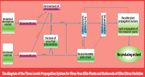 In recent years, the National Citrus Virus Exclusion Center has obtained a breakthrough in the rapid identification technology in molecular biology, including construction of the rapid identification system for citrus viruses and virus-like diseases. Following the overseas experiences and experiences in our own country, we firstly proposed the idea of a technique strategy for the Three Levels Propagation System of the Virus-free Elite Citrus Varieties in order to provide a scientific basis for the improvement of citrus plant quality in our country. Based on the overseas advanced experiences, the standardized container plant propagation system was established, and the propagation demonstration base for the virus-free citrus was built: these propagation techniques have caught up with the international advanced level.