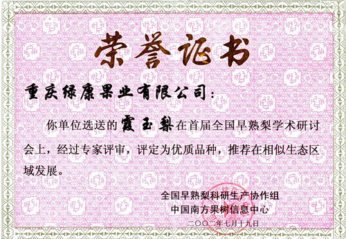 2002年7月,在由全国早熟梨科研生产协作组、中国南方果树信息中心等单位主办的“首届全国早熟梨学术研讨会”上,重庆绿康果业有限公司选送的龙泉酥、青魁、雪芳、早丰、桂冠、西子绿、霞玉、雪青、早香蜜等9个梨品种被评为优质品种,推荐在相似生态区域发展。sXh中柑所在线